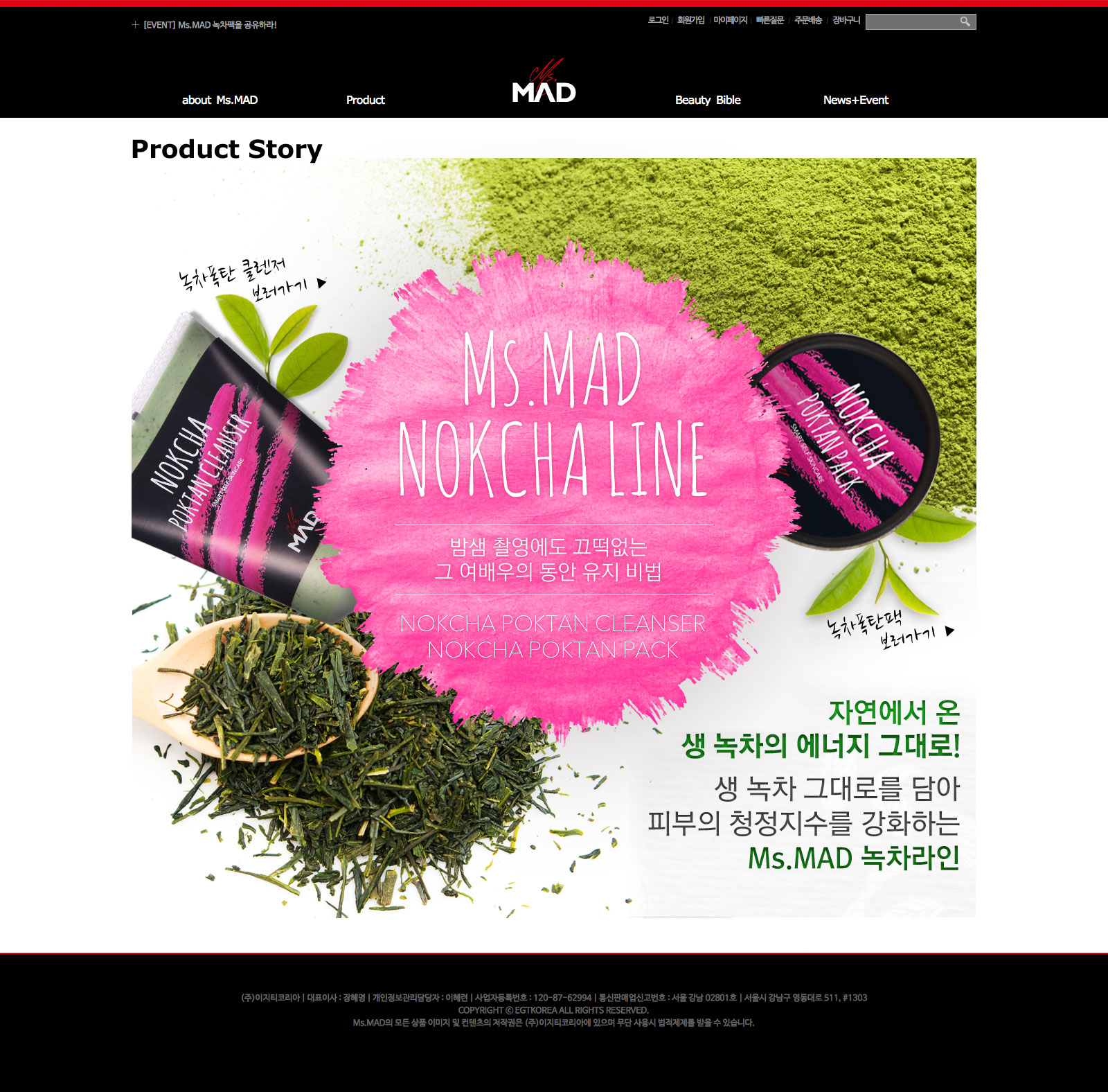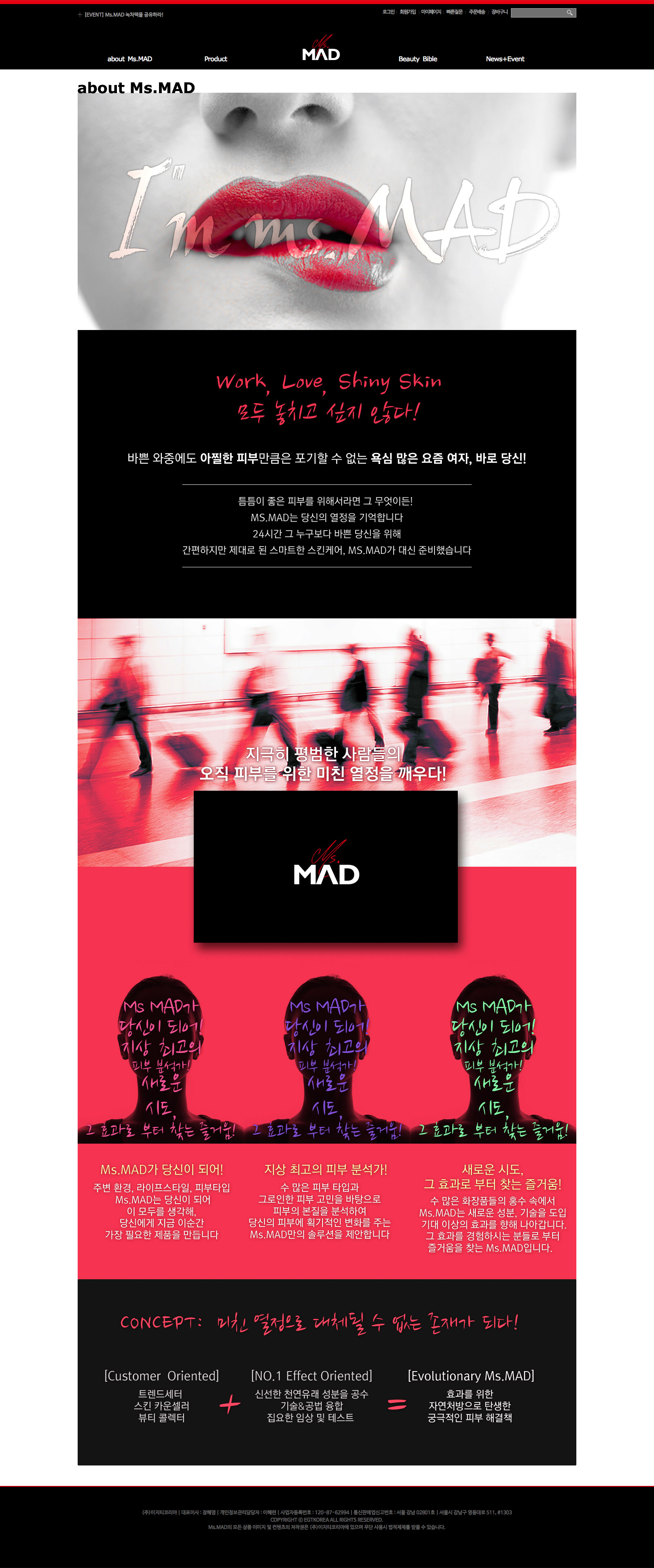 "미친 열정으로 대체될 수 없는 존재가 되다!"란 컨셉으로 출시된 미스매드는 정직한 이름의 화장품 <유리피부>의 자사 브랜드로 천연유래 성분을 공수. 기술&공법 융합. 집요한 임상 및 테스트를 거쳐 제품 출시 준비중에 있어 트렌디한 시각적 이미지의 제품홍보로 방문자들에게 기대감을 갖게 하고 있습니다.