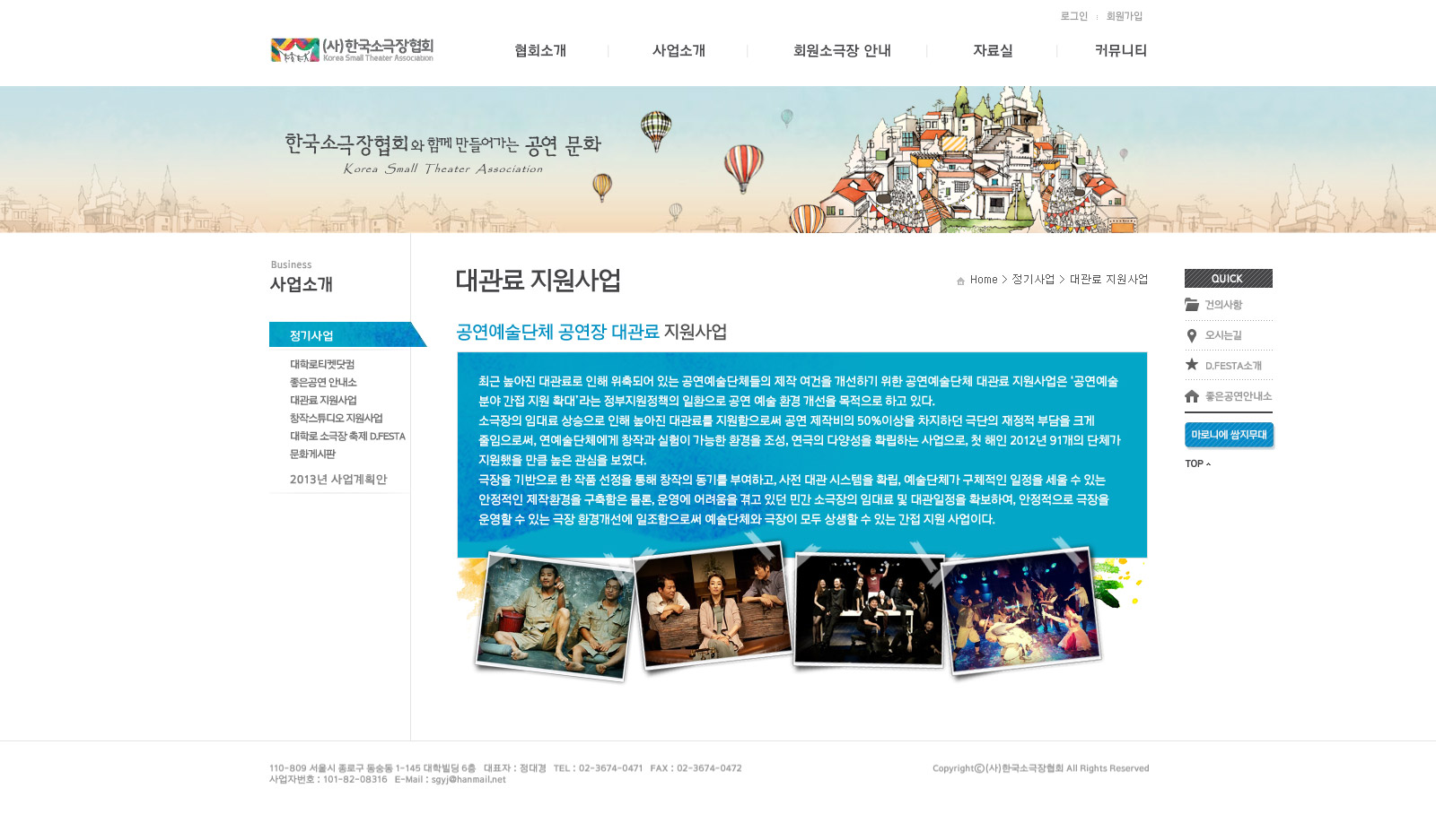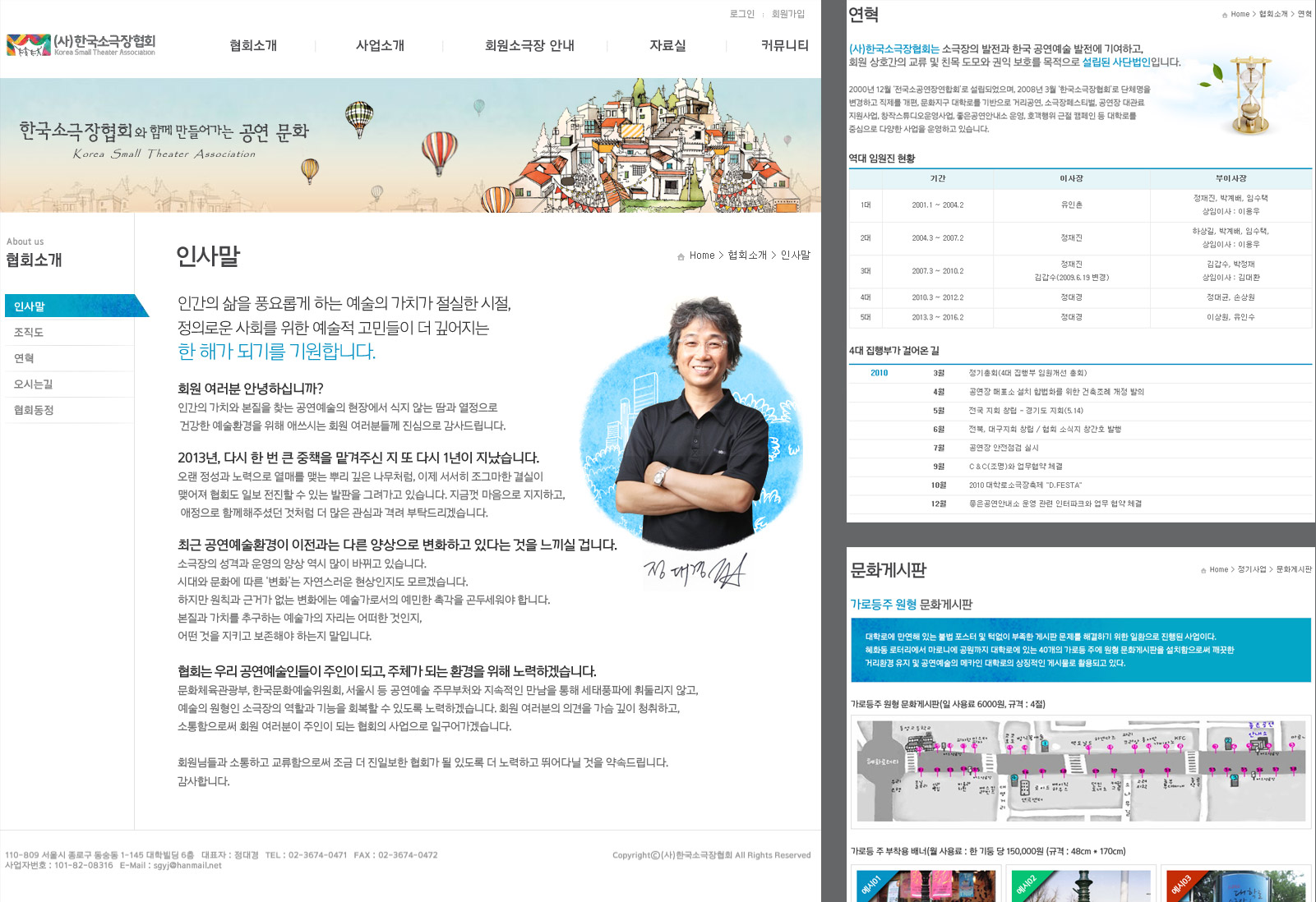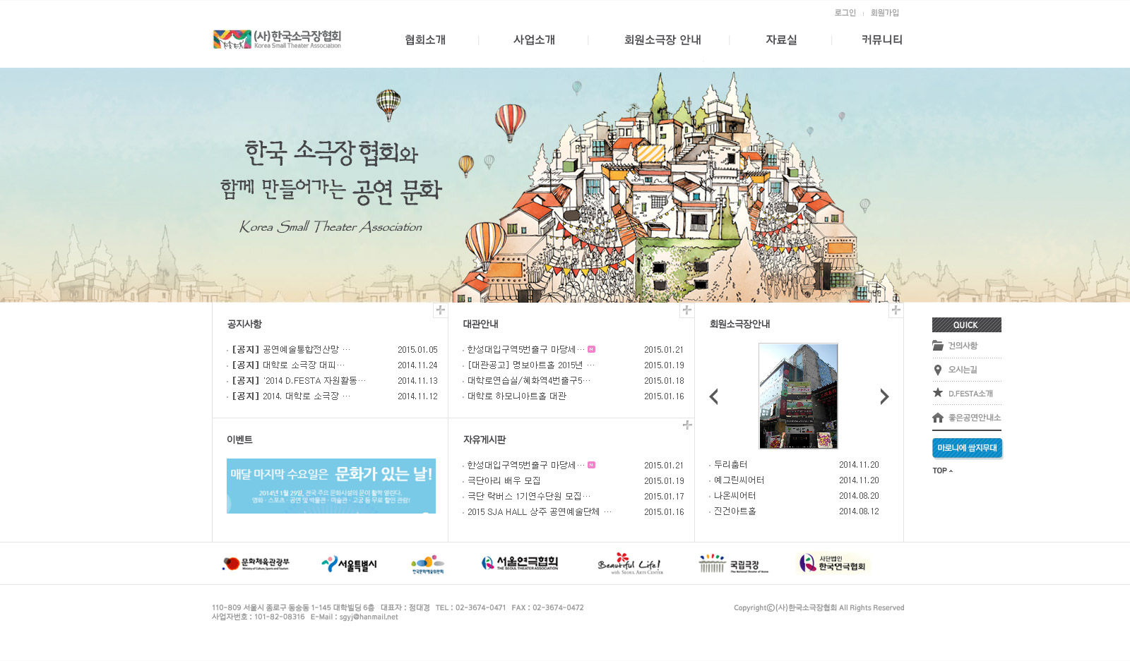 공연문화를 만들어가는 한국소극장협회의 웹사이트는 대학로 소극장 축제 D.FESTA의 포스터에 사용된 일러스트를 활용하여 공연축제의 이미지와 대학로의 젊음과 자유로움을 느낄 수 있도록 디자인되었습니다.
