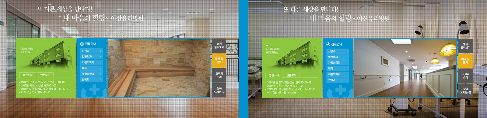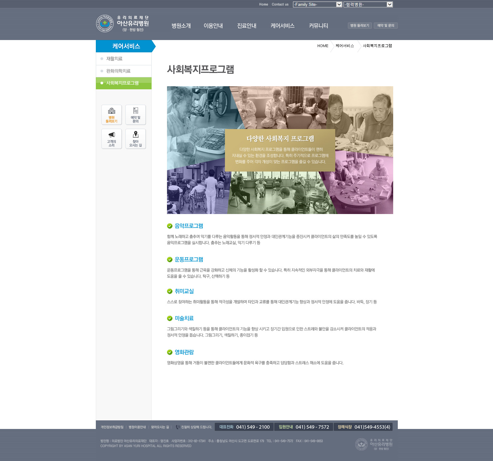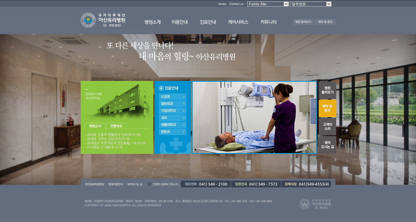 전원속 호텔식 토탈 헬스케어 병원을 지향하는 아산유리요양병원은 요양병원의 부정적 시각을 없애고, 휴향형 호텔식 병원의 이미지를 살리기 위함에 목적을 두고 밝고 건강한 컨셉으로 디자인되어 구축되었습니다.