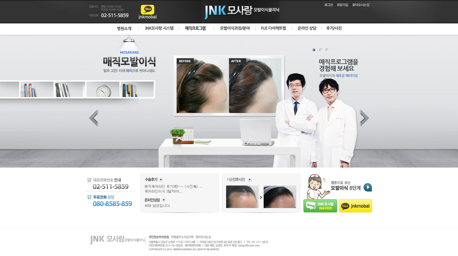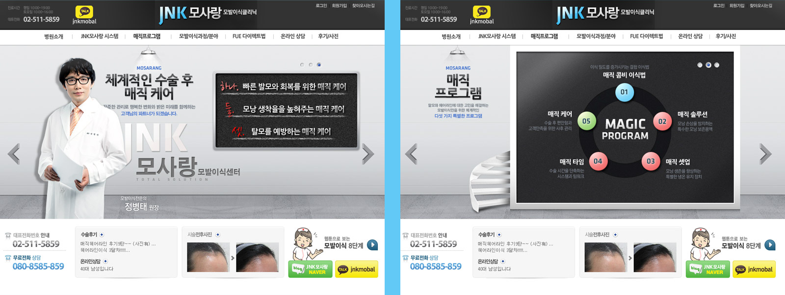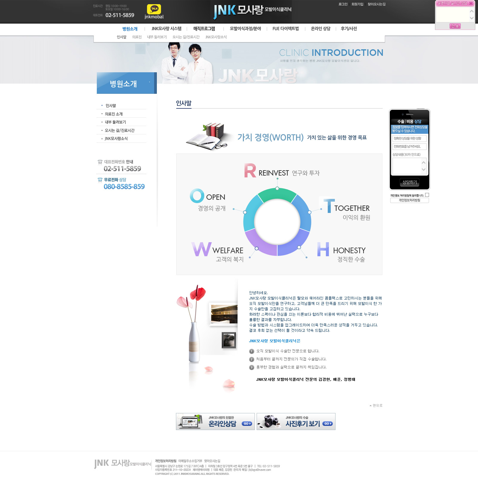 병원의 인지도 강화와 신뢰성을 높이기 위해서 JNK모사랑 원장선생님들의 실제 사진과 가상의 병원 공간을 이미지 컨셉으로한 스토리텔링으로 메인 비주얼이 구성되었습니다.