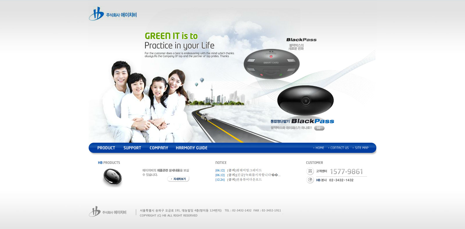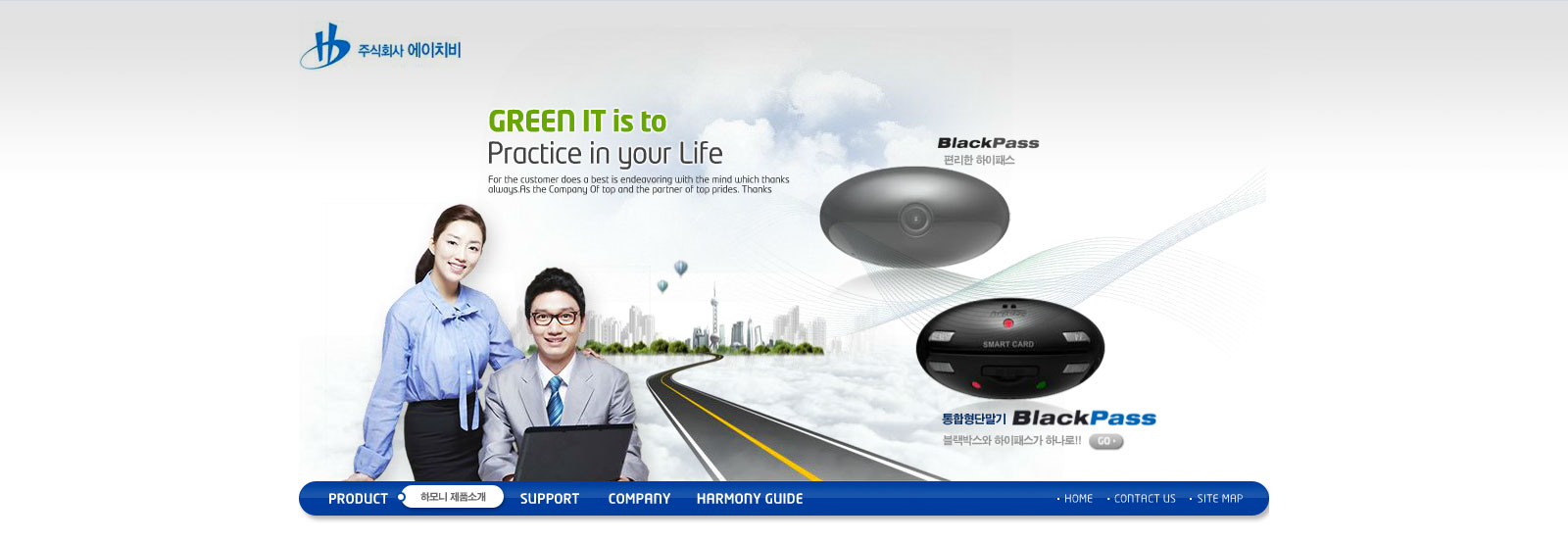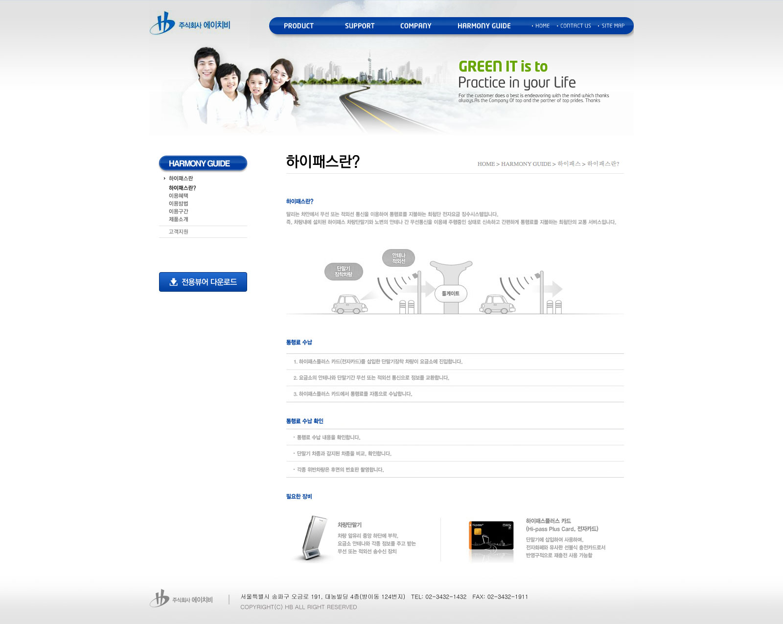 에이치비는 하이패스와 블랙박스를 결합한 일체형 복합단말기 <하모니>를 개발, 출시한 업체로 이번 개발 제품인 하모니의 홍보 목적으로 사이트가 제작되었습니다. 제품의 특징을 살린 전반적인 디자인과 전용뷰어 다운로드로 제품에 대한 정보를 쉽게 습득할 수 있게 구성되었습니다.